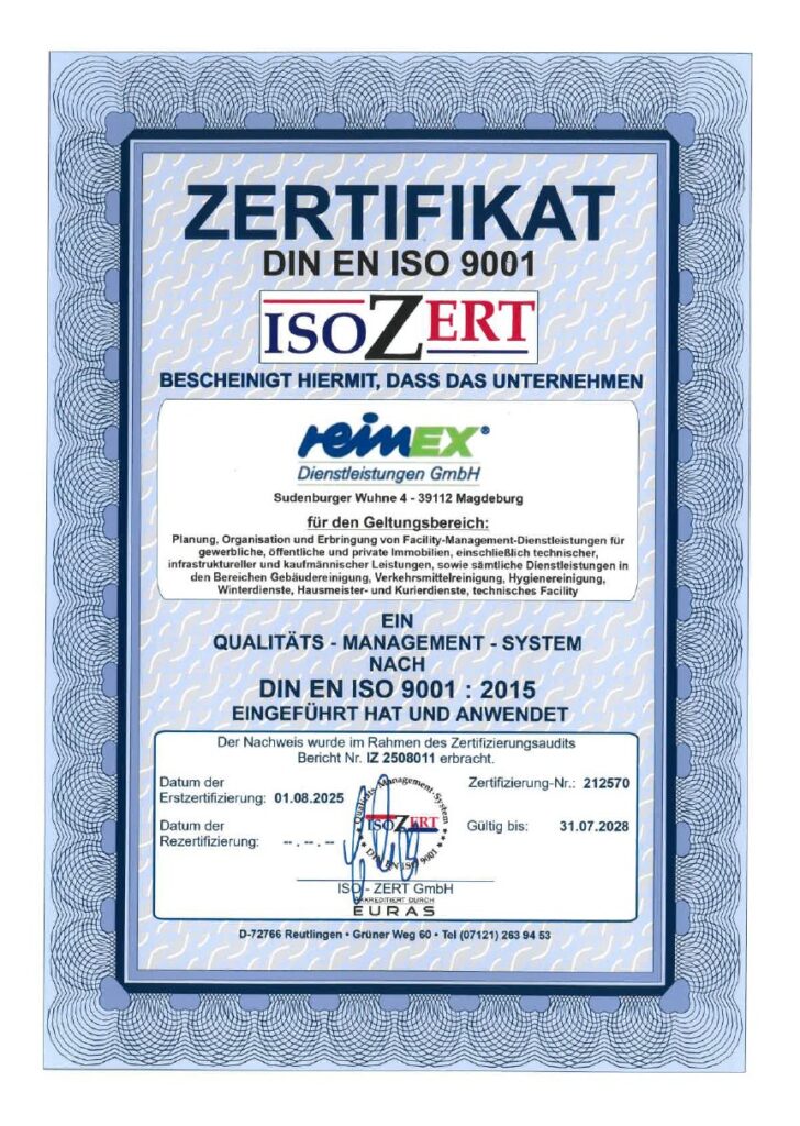 Planung, Organisation und Erbringung von Facility-Management-Dienstleistungen für gewerbliche, öffentliche und private Immobilien, einschließlich technischer, infrastruktureller und kaufmännischer Leistungen sowie sämtliche Dienstleistungen in den Bereichen Gebäudereinigung, Verkehrsmittelreinigung, Hygienereinigung, Winterdienste, Hausmeister- und Kurierdienste, technisches Facility